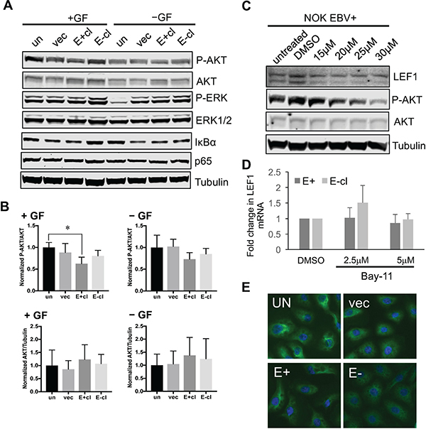 Figure 7: Upregulation of LEF1 in EBV-infected NOK is independent of AKT or NF-kB activity. (A) Analysis of AKT, ERK, and NF-kB activation in EBV-positive NOK in the presence (+GF) or absence (-GF) of growth factors supplements. Representative western blots are shown examining phosphorylation of AKT (P-AKT S473); and ERK (P-ERK T202/Y204). The levels of the IkBα inhibitor of NF-kB is also shown. The total protein levels of AKT, ERK, and p65 are shown. Tubulin served as an additional loading control. (B) The ratio of P-AKT to total AKT (top panels) and total AKT to tubulin (bottom panels) is shown. (C) Effect of the PI3K inhibitor, LY294002, on LEF1 protein levels. Increasing concentration of LY294002 was used and the levels of LEF1 protein were measured. The level of P-AKT was used as an indicator for inhibition of AKT activity. Shown are representative blots for LEF1, P-AKT, AKT, and tubulin. (D) Effect of Bay11 on LEF1 transcript levels. qRT-PCR was used to measure LEF1 transcript levels with 2.5 and 5 uM of Bay11. (E) Immunofluorescence to visualize p65 localization. Un: uninfected, parental NOK, vec: vector control, E+cl: EBV-positive NOK, E-cl: EBV-negative transiently infected cl3.