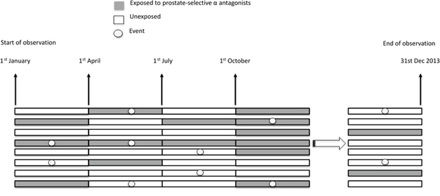 We established a cohort of patients aged 20 years or older who received a new diagnosis of prostate cancer between 1 January 1997 and 31 December 2008 (Figure 1). A minimum of one year of observation before the date of diagnosis and five years of follow-up were required for inclusion in the analysis [26]. Patients were grouped according to use of ADT (including gonadotropin-releasing hormone agonists (GnRH), anti-androgen agents, and bilateral orchiectomy). Each calendar year was partitioned into four quarters for each patient and each year after ADT (Figure 2). The analytic unit was thus one quarter. We identified all person-quarters with exposures to tamsulosin, alfuzosin, or silodosin and those without such exposures.