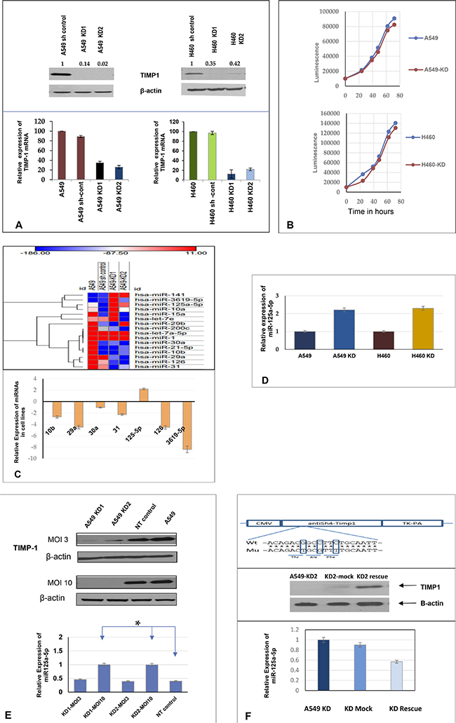 To further confirm bona fide knockdown of TIMP-1, we carried out a rescue assay for the A549 KD2. This resulted in the re-expression of TIMP-1 and a subsequent decrease in miR-125a-5p expression (Figure 1F).