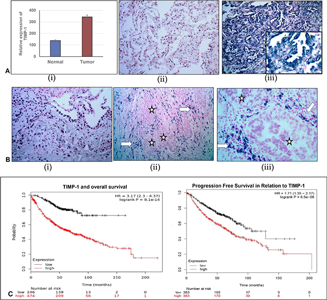 Figure 3: Comparison of relative expression of TIMP-1 and miR-125a-5p in normal adjacent lung tissue and lung adenocarcinoma. (A) (i) Relative expression of TIMP-1 as detected by RT-PCR. (ii) and (iii) TIMP-1 expression detected by in-situ hybridization: (ii) Minimal TIMP-1 expression in normal adjacent tissue, 40× original magnification; (iii) High expression of TIMP-1 in representative tumor tissues 100× original magnification, inset- 400× original magnification. (B) (i): miR-125a-5p expression in normal adjacent tissue, detected by in-situ hybridization: 100× original magnification; (ii) and (iii) Almost total absence of miR-125a-5p expression in tumor cells (*) although some expression is seen within surrounding stromal region of the tumor (arrows) - 100× and 400× original magnification, respectively. (C) Kaplan Meier plots showing survival of patients in relation to TIMP-1 expression: To show the relationship of TIMP-1 with survival of patients we curated data manually, from expression arrays by KM Plotter, reference: PLoS One. 2013 Dec 18;8(12):e82241.54,675 Affymetrix probe set IDs (Affymetrix HG-U133A, HG-U133 Plus 2.0 and HG-U133A 2.0) and 70,632 gene symbols.