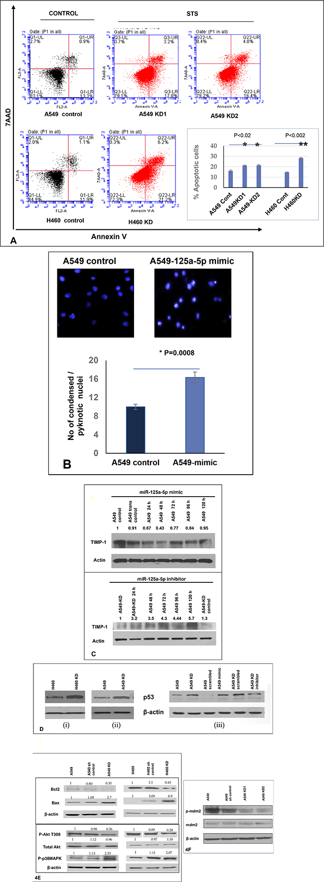 Figure 4: Increased level of miR-125a-5p in TIMP-1 KD clones is associated with induction of apoptosis and directly targets TIMP-1. (A) Flow cytometric analysis of A549 and H460 cells treated with 0.5 μM Staurosporine for 1 hour and stained with Annexin V-PE and 7AAD. Representative figures showing more apoptosis or cell death seen in TIMP-1 KD cells. Lower Right quadrant-Annexin positive cells, showing early apoptosis; Upper Right quadrant-Annexin positive, showing late apoptosis; Upper Left quadrant showing dead cells. Only live cells were considered for analysis (P1). Graphical representation of the data (% apoptotic cells ± SEM) from two independent experiments is shown on the right. (p < 0.02*, p < 0.002**, t-test). (B) A549 cells were transfected with miR-125a-5p mimic and stained with Hoechst 33342. MiR-125a-5p cells showed significant increase in pyknotic nuclei as represented in the figure and graph below (p = 0.0008). The graph represents average value of 3 experiments ± SD. (C) A549 cells were transfected with miR-125a-5p mimic (10 nM) followed by western blot analysis to determine the level of TIMP-1 protein. The cells were harvested at 24, 48, 72, 96 and 120 hours with maximum TIMP-1 downregulation at 48 hours (top). Introduction of miR-125a-5p mimic induced downregulation of TIMP-1 after 48 hours in A549 cells. Representative figure showing upregulation of TIMP-1 with addition of miR-125a-5p antagomirs (5 nM) increased the expression of TIMP-1 level over 5 days. (D) Upregulation of p53 in A549 cells after TIMP-1 knockdown: Transfection of miR-125a-5p mimic upregulates p53 and inhibitors of miR-125a-5p downregulates p53 in A549 cells. (E) Status of pro and antiapoptotic proteins: With TIMP-1 knockdown the anti-apoptotic proteins phospho-Akt and Bcl2 levels were down-regulated and the prp-apoptotic proteins Bax and phospho-p38MAPK were upregulated. The protein expression was normalized to β-actin. Data is representative of three independent experiments. (F) Representative protein levels of mdm2: mdm2 phosphorylation is reduced after TIMP-1 knockdown, the total protein level remains unaltered.