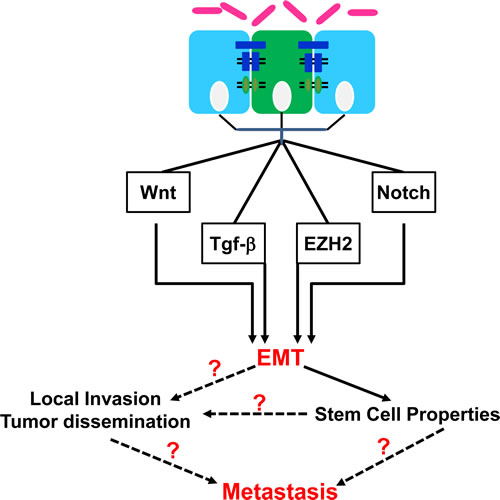 Figure 1: Epithelial-to-mesenchymal transition (EMT) pathways deregulated in cancer and the downstream effects. Citrobacter rodentium (CR) binding to the luminal surface of the large intestine in a susceptible host can influence the epigenetic signaling within the stem (green) and/or progenitor (blue) cells to promote inflammation and EMT. The diagram demonstrates a variety of effector pathways for EMT as well as the downstream consequences related to either local invasion or distant metastasis. Dotted lines and question marks represent the current focus in our laboratory.