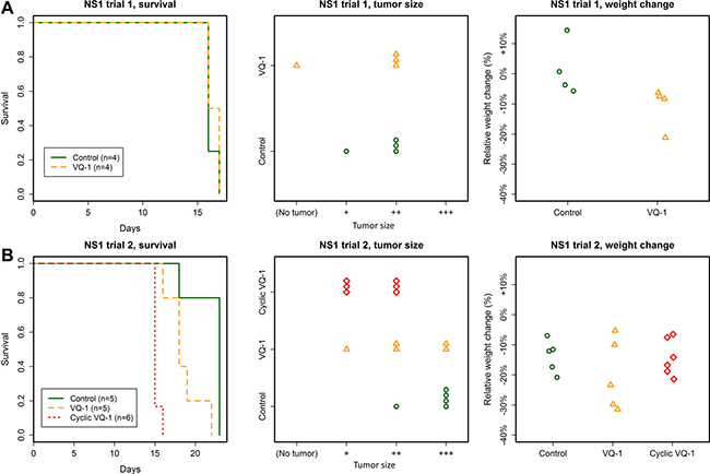 Figure 4: Summary of the NS1 trials. (A) No effect of VQ-1 treatment was seen in animals with NS1 tumors, regarding survival or tumor size (NS1 inoculation with 50 000 cells). Mean survival in VQ-treated rats was 16.4 ± 0.5 days and in control animals 16.2 ± 0.5 days. There was no statistically significant weight difference between the two groups. (B) No effect of VQ-1 treatment was seen in animals with NS1 tumors, regarding survival or tumor size (NS1 inoculation with 5 000 cells). Mean survival in VQ-1 treated rats was 18.6 ± 2.2 days for standard protocol and 15.2 ± 0.4 days in the cyclic protocol; as compared to 22 ± 2.2 days for control animals. Since the cyclically treated animals died significantly earlier than control animals, meaningful comparison of tumor size could not be made.