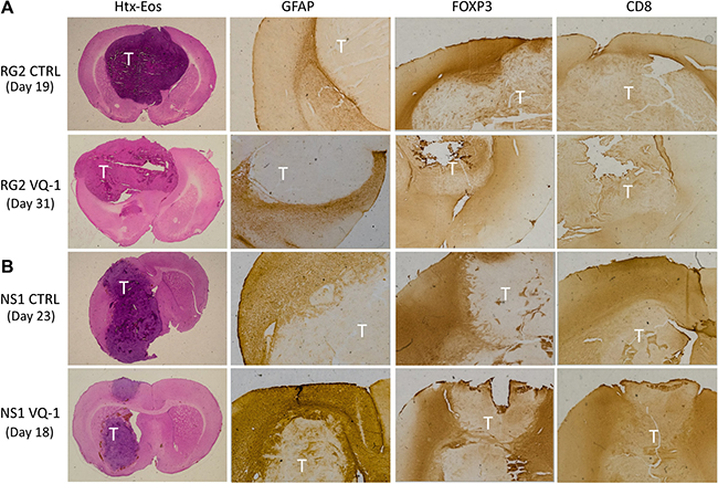 Figure 5: Immunohistochemical staining of excised brains. Tumor areas are marked with “T” in images. (A) Immunohistochemistry comparing VQ-1 treated RG2 tumors to control with only vehicle. Text to the left indicates at which time the animal was euthanized. No clear difference was noted with any of the performed stainings, but it seems like infiltration of FOXP3 expressing cells is greater in the control situation as compared to the VQ-1 treated animals. (B) FOXP3 is present around the tumor in both the control animal and the VQ-1 treated animal. Moreover, GFAP was demonstrated around the tumor front in both situations, and the core seemed to consist of a more necrotic tumor bulk.