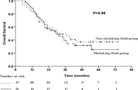 In this study, shrinking field radiation slightly reduced overall survival, though this difference was not statistically different. One reason that may partly explain this phenomenon is the larger tumor volume of the patients with tumor shrinkage may negatively impact prognosis [22, 23]. Moreover, different treatment after disease progression may influence OS. This was why we focused more attention on PFS than OS, as PFS may more accurately reflect the efficacy of shrinking field therapy. Thirdly, this retrospective cohort was small, therefore may be ofaffected by sampling bias.