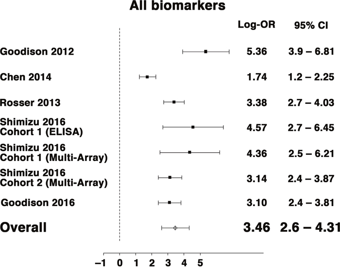 The log OR for each biomarker was improved by 1.5 or greater with smaller 95% CI in our meta-analysis of the overall cohort compared with each analysis of an individual cohort. A1AT (log OR: 2.40, 95% CI: 1.49–3.29), PAI1 (log OR: 2.30, 95% CI: 1.71–2.89) and IL-8 (log OR: 2.29, 95% CI: 1.63–2.96) showed the highest log OR, while MMP10 (log OR: 1.36, 95% CI: 0.87–1.85) showed the lowest (Figure 4).