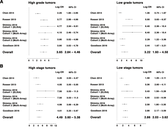 Figure 3: Forest plot for random-effects meta-analysis of the association between multiplex BCa biomarkers and tumor grade (A, high-grade, left panel, low-grade, right panel) and tumor stage (B, T2 or greater stage, left panel and Ta/T1 stage, right panel) (n = 1,173). Effect sizes are expressed as odds ratios. Studies are represented by symbols whose area is proportional to the weight of the study in the analysis.