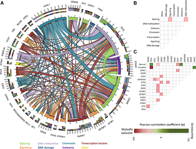 Pathways were defined as previously described (4, 5) and included: RNA splicing (SF3B1, SRSF2, U2AF1, and ZRSR2), DNA methylation (DNMT3A, IDH1, IDH2 and TET2), chromatin regulation (ASXL1, EZH2 and MLL3), transcription regulation (BCOR, CEBPA , CUX1, ETV6, GATA2, PHF6, RUNX1 and WT1), kinase signaling (CBL, FLT3, JAK2, KRAS, PTPN11, NF1, NRAS and SETBP1), cohesin pathway (STAG2), DNA damage (ATRX and TP53) and other (DDX41 and ETNK1).