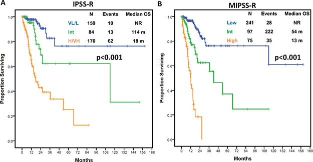 FFigure 4: Overall survival outcomes by IPSS-R and molecular IPSS-R model in the discovery cohort. (A) Kaplan-Meier estimates of overall survival in the study cohort according to the integrated Molecular IPSS-R model. (B) Kaplan-Meier estimates of overall survival in the study cohort by IPSS-R scoring system.
