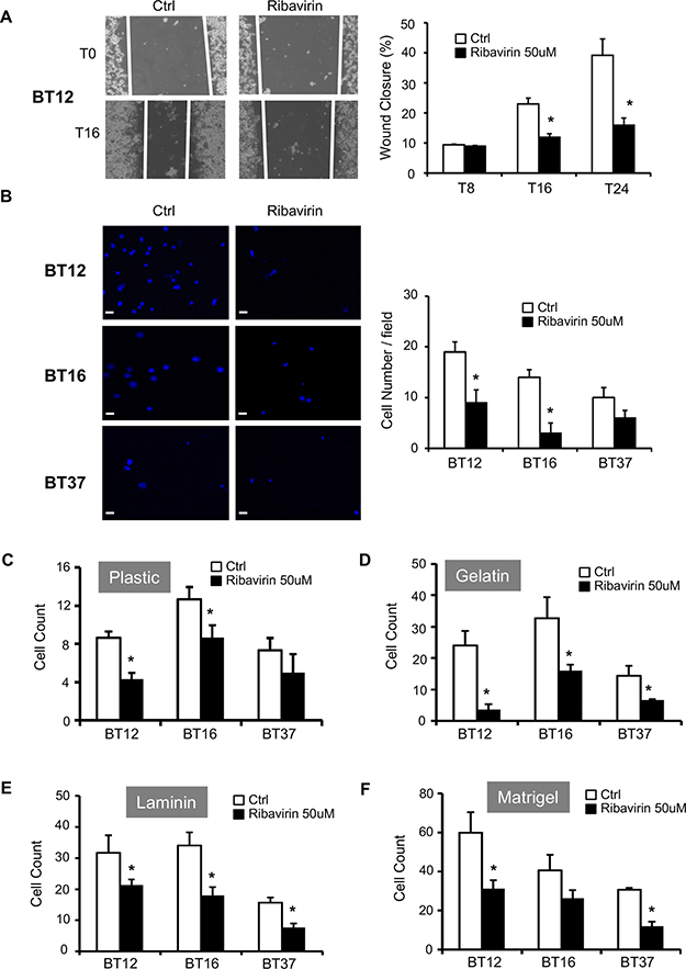 Figure 3: Ribavirin reduces AT/RT migratory, invasive, and adhesive capacities. (A) Migration of control BT12 cells (Ctrl) and ribavirin-treated cells (Ribavirin 50μM) was assessed using scratch wound assays. Representative photographs were taken immediately after the scratch (T0), and 16hrs later (T16). Quantifications of the percentage of wound closure determined at 8hrs (T8), 16hrs (T16), and 24hrs (T24) after scratch. Wound closure was significantly decreased for ribavirin-treated cells compared to vehicle-treated control cells at 16hrs and 24hrs (*p < 0.05, n = 3). (B) Invasion of control cells (Ctrl) and ribavirin-treated cells (50μM) was assessed using a Boyden chamber assay. Representative photographs were taken after 16hrs. Scale bar=15μm. Quantification of the number of cells per field (at least 6 fields) was determined at 16hrs. Invading cell number was significantly decreased for BT12 and BT16 ribavirin-treated cells compared to vehicle-treated control cells at 16hrs (*p < 0.05, n = 3). Adhesion capacities of BT12, BT16, and BT37 cells treated or not with ribavirin (50μM) on plastic (C), gelatin (D), laminin (E) and MatrigelTM (F) were determined using adhesion assays. Ribavirin treatment significantly decreased the number of adherent cells on each substrate (*p < 0.05, ribavirin compared to control, n = 3).