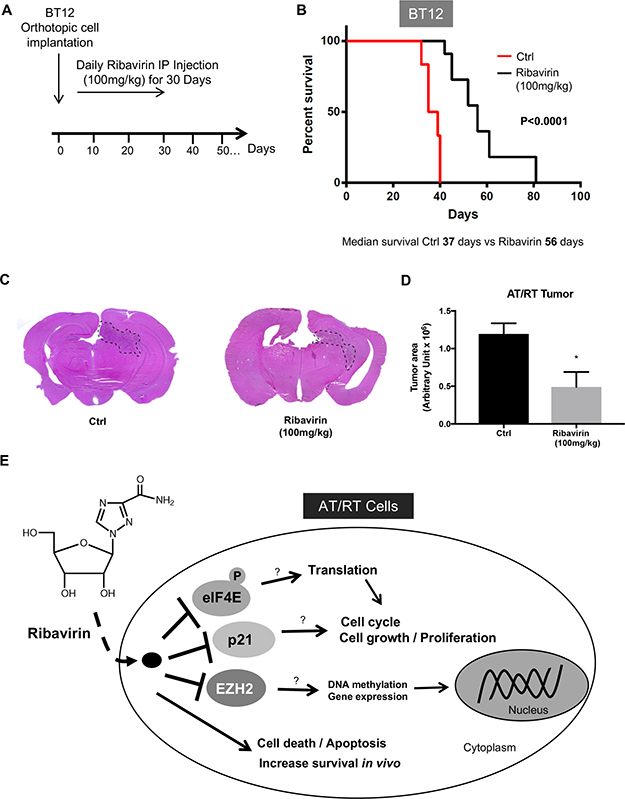 Figure 5: Increased survival of ribavirin-treated mice intracranially implanted with BT12 cells. (A) After orthotopic BT12 cell implantation, mice were treated daily with IP injection of ribavirin 100mg/kg or vehicle control. (B) Kaplan-Meier survival curves following intracranial implantation of BT12 cells in immuno-deficient (Nu/Nu) mice and treatment with vehicle control (red curve, n = 6) or ribavirin (100mg/kg, black curve, n = 6). Ribavirin-treated animals exhibit a significantly increased median survival (56 days) compared to controls (37 days) (p < 0.0001). (C) Representative photographs of H&E stained sections of mouse brains 20 days after BT12 cell implantation and ribavirin (100 mg/kg) or vehicle treatment. (D) Quantification of tumor area revealing significantly decreased tumor size at day 20 after implantation in the ribavirin-treated group (p < 0.05). (E) Schematic representing the effects of ribavirin treatment on AT/RT cells. Ribavirin impairs multiple components of AT/RT tumorigenicity including cell proliferation, cell cycle progression, cell survival, and migration/invasion and adhesion properties. In vivo, ribavirin improves survival in an orthotopic model of AT/RT.