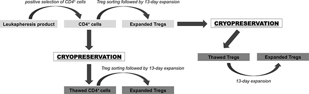 Adoptive transfer of Tregs as a therapy could be more easily clinically applied if ready-to-use cell products could be stored to be available for infusion to the patient at the optimal time. Furthermore, cells could be manufactured in highly specialized centers and distributed for therapy to distant clinical locations. Cell banking would also allow for better synchronization of Treg application and pharmacological immunomodulation. It would allow for retrieving of cells from patient for processing prior to pharmacological therapy, which could affect Treg recovery and/or function. Additionally, such immunomodulation may further improve the effect of Tregs after cell infusion [43]. Currently, the immunosuppression used in clinical practice usually has a detrimental effect on Tregs and only few medications like mTOR inhibitors, are Treg “friendly” [43].