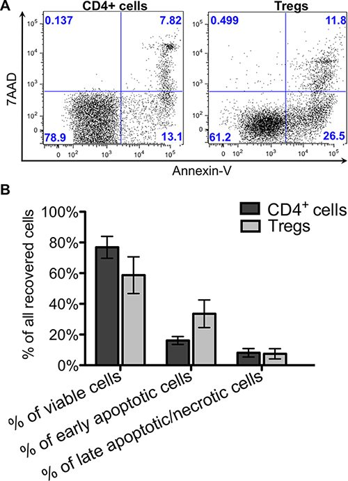 Figure 3: Cell viability and apoptosis just after thawing. Viability with apoptosis of thawed CD4+ and Treg cells was analyzed after staining with Annexin V and 7AAD. (A) Flow cytometric dot plots from representative experiment showing percentage of viable – Annexin V- 7AAD-, early apoptotic – Annexin V+ 7AAD- and late apoptotic/necrotic – Annexin V+, 7AAD+ for Treg and CD4+ cells. (B) Graph showing viability with apoptosis of thawed CD4+ and Treg cells. Results are expressed as mean ± SD; (n = 3) for cryopreserved CD4+ cells and (n = 4) for cryopreserved Tregs.
