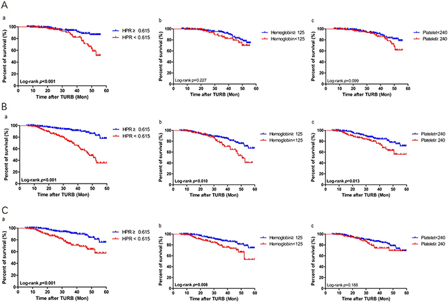 Recently, there has been increasing interest in the prognostic role of hematologic biomarkers in patients undergoing TURB. Neutrophil-lymphocyte ratio (NLR) has been repeatedly reported as an efficient biomarker to predict oncologic outcomes in patient undergoing TURB for NMIBC [6, 7]. Other hematologic biomarkers, including lymphocyte-monocyte ratio (LMR), platelet-lymphocyte ratio (PLR), have also been suggested [7, 8]. While attention is mainly focused on biomarkers that reflect the interaction between systemic inflammatory response and tumor, to date, the prognostic role of hemoglobin-platelet ratio has not been studied in T1G3 BC. Its consistency and significance as prognosticator are still unclear in T1G3 BC.