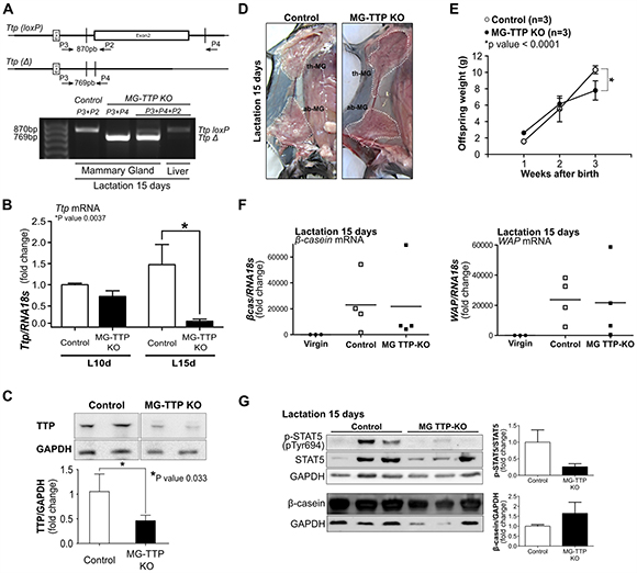 At 15 days of lactation, MG-TTP KO glands showed less milk accumulation than glands from control mice (Figure 1D). This observation suggested that a decreased milk production might be the reason for the reduced average weight detected in the MG-TTP KO offspring at the end of lactation (Figure 1E). Although no significant differences between experimental and control mice were found in β-casein and WAP mRNA levels and in β-casein protein expression, STAT5 phosphorylation (P-STAT5) was homogeneously low in experimental glands at this time (Figure 1F and 1G). We understand that variability of milk protein mRNA levels observed among each group was due to natural declining of milk production, which Eliminate naturally occurs in the third week of lactation (also shown by the variable levels of P-STAT5 in the control group). In fact, it has been established that a sharp drop in milk yield naturally happens at 15 days of lactation, concomitantly with pups initiating dry food consumption [32].