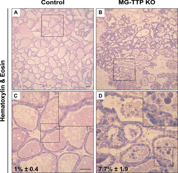 Figure 2: Loss of TTP expression in lactating mammary glands induces cell death. Representative images of H&E staining in mammary gland from control and MG-TTP KO: (A and B) original magnification 100X. (C and D), original magnification: 400X; c&d magnification of regions framed in a&b; insets: framed regions in c&d, respectively; percentages of apoptotic-like cells in H&E stained samples are indicated, mean + s.e.m; n = 3; p = 0.013 in c&d.