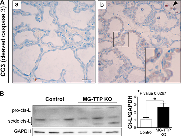 Figure 3: Cleaved caspase 3 (CC3) and active Cathepsin-L in MG-TTP KO lactating glands. (A) Representative images of CC3-IHC in mammary glands from Control and MG-TTP KO at 15 days of lactation; original magnification: 400X. In b) CC3 positive stained cells attached to the extracellular matrix are shown amplified in the inset. Arrowhead indicates CC3 positive cells into alveolar lumens. Scale bar 100 μm. (B) Representative image and quantification (mean+s.e.m., n = 3) of WB analysis showing the increase of Cathepsin-L (cts-L; sc, single chain, dc, heavy chain of the double-chain form) from Control and MG-TTP KO mammary glands at 15 days of lactation (n = 3).