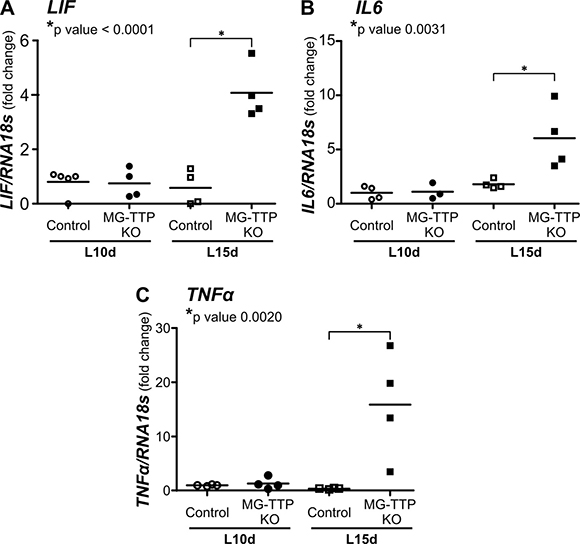 Figure 5: Increase of inflammatory cytokine mRNA levels in 15-day lactating MG-TTP KO mice. RT-qPCR analysis of LIF, IL6 and TNFα levels normalized to 18S RNA; fold changes compared to control at L10d are shown. L10d: 10 day lactating; L15d: 15 day lactating mice. Each point corresponds to a different mouse and the stripe corresponds to the average value in each group. P values of statistical differences between Control and MG-TTP KO at L15d are shown for each cytokine.