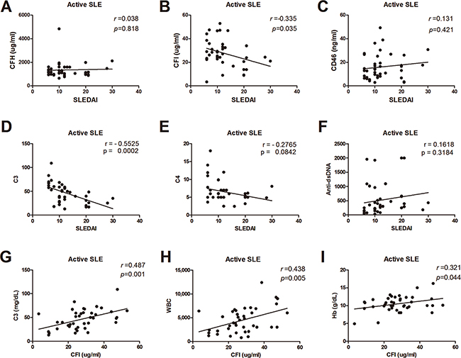 Figure 3: Correlations between serums CRPs, C3, C4, anti-dsDNA, and disease activity. (A) Serum CFH levels and SLEDAI. (B) Serum CFI levels and SLEDAI. (C) Serum CD46 levels and SLEDAI. (D) Serum C3 levels and SLEDAI. (E) Serum C4 levels and SLEDAI. (F) Serum anti-dsDNA and SLEDAI. (G) Serum CFI levels and C3. (H) Serum CFI levels and whit blood count. (I) Serum CFI levels and hemoglobin.