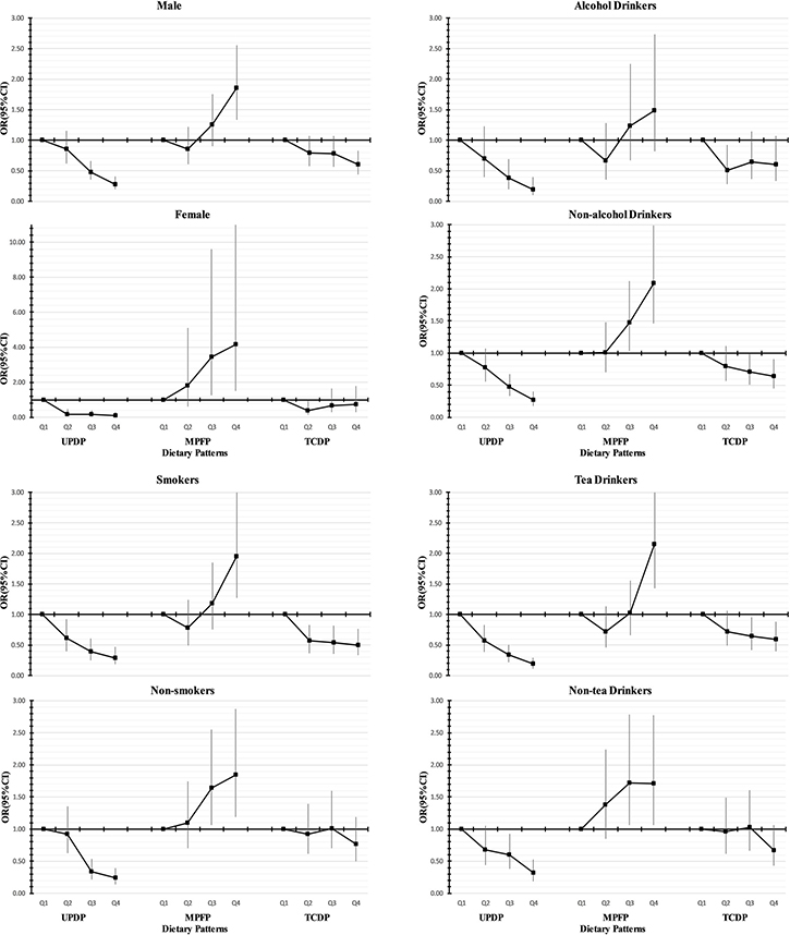 Figure 1: Adjusted Odds ratios (ORs) and 95% confidence intervals (CIs) of primary liver cancer for quartiles of dietary pattern stratified by gender, alcohol use, smoking and tea drinking: adjusted for sex, age, BMI, education level, income level, smoking, drinking, drink tea, physical activity, marital status, multivitamin use, and hypertension and diabetes status.