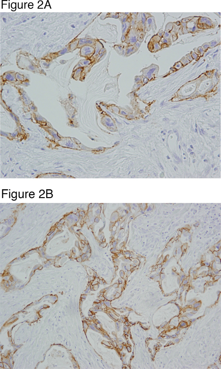Figure 2: Illustration of a case of invasive ductal carcinoma that shows membranous staining for CD44v in nearly all tumor cells at baseline (x20) (Figure 2A). The residual tumor following neoadjuvant chemotherapy shows persistent positivity for CD44v (x20) (Figure 2B).