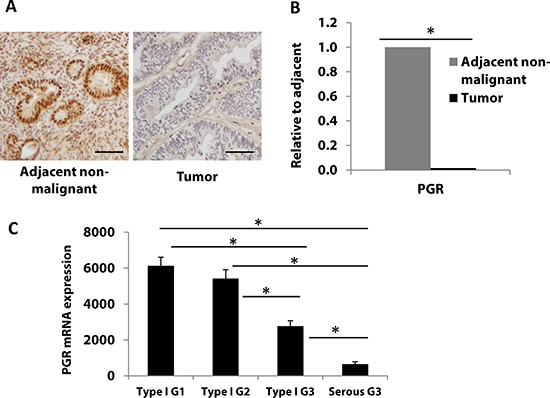 Figure 1: Progesterone receptor expression is frequently downregulated with progression of endometrial cancer. A, B PR protein (A), and PGR mRNA (B), expression was measured in endometrial tumors (n=5) and matched adjacent non-malignant tissue (n=5) by immunostaining and real-time PCR, respectively. Scale bar = 50 μm. Student’s t-test was used for comparisons of two groups. (C) PGR mRNA expression was analyzed in 361 endometrial cancer patient tumors from TCGA database. Patients were divided into four groups: endometrioid type I grade 1 (G1, n=84), grade 2 (G2, n=100), grade 3 (G3, n=115) and serous Type II grade 3 (G3, n=62). Error bars, SEM. Statistical analysis was conducted using one way ANOVA with significance level set at α=0.05. All pairwise multiple comparisons were performed using Holm-Sidak method with Bonferroni correction. The results showed that all individual groups are significantly different from each other (p< 0.001) except between Type I G1 and Type I G2 (p=0.209).