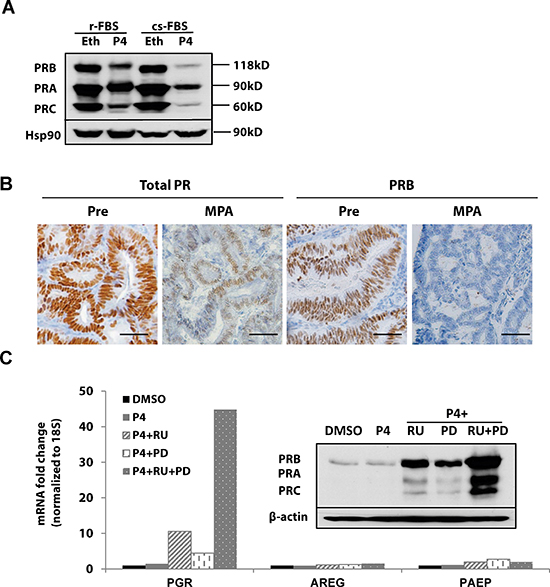 Figure 2: Ligand-dependent PR downregulation. (A) Western blotting: T47D breast cancer cells were grown in DMEM media supplemented with regular fetal bovine serum (r-FBS) or charcoal-stripped serum (cs-FBS), followed by treatment with ethanol (vehicle control) or 100 nM progesterone (P4) for 24h. PR protein was detected using specific PR antibodies, and HSP90 serves as a loading control. (B) Immunohistochemistry: endometrial tumor specimens were collected before or 21 days after MPA treatment (400 mg, intramuscularly) and total PR and PRB expression was assessed by immunohistochemistry. Scale bar = 50 μm. (C) q-PCR and Western blotting: ECC1 cells were treated with DMSO (vehicle control), 100 nM P4, 100 nM P4 and 1μM PR antagonist RU486 (RU), 100 nM P4+ 1 μM MAPK inhibitor PD0325901(PD) or the combination of P4+RU+PD for 24h. mRNA expression of PGR, AREG and PAEP was measured by q-PCR, normalized to 18S, and data displayed as fold-change relative to DMSO control. Comparisons of normalized expression values (ΔCt) employed the conventional ΔΔCt fold change method. The insert is PR protein expression after the same treatment; β-actin, loading control.