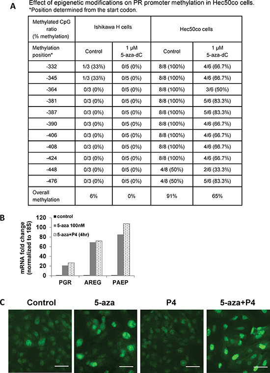 Figure 3: PGR promoter methylation represses PR expression in serous endometrial cancer cells. (A) Bisulfite sequencing. PGR promoter methylation was quantified in Ishikawa H and Hec50co cells before or after hypomethylating agent 5-aza-decitabine (5-aza-dC) treatment. (B) q-PCR analysis. Hec50co cells were treated with DMSO (vehicle control), 100 nM 5-aza-dC for 5 days with fresh 5-aza-dC added every other day, 5-aza-dC for 5 days +100 nM P4 for 4h. mRNA expression of PGR, AREG and PAEP was measured by q-PCR and normalized to 18S, and data are displayed as fold-change relative to DMSO control. Comparisons of normalized expression values (ΔCt) employed the conventional ΔΔCt fold change method. (C) Representative immunofluorescent image showing PR expression in Hec50co cells treated with DMSO control, 5 days of 100 nM 5-aza-dC, 100 nM P4, or both. Scale bar = 50 μm.
