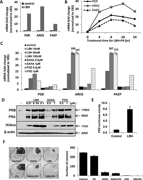 Figure 4: Histone deacetylase (HDAC) inhibition restores PR mRNA and protein expression in Type I Ishikawa H cells. (A) q-PCR analysis. Ishikawa H cells were treated with DMSO control or 20 nM LBH589 (LBH) for 24 h. PGR, AREG and PAEP mRNA expression was normalized to 18S, and all q-PCR data are displayed as fold-change relative to DMSO control. Comparisons of normalized expression values (ΔCt) employed the conventional ΔΔCt fold change method. (B) PR expression and activity corresponding to time course of P4 stimulation: Ishikawa H cells were treated with 20 nM LBH +100 nM P4 for the indicated times, and PGR, AREG and PAEP mRNA expression was quantified by q-PCR and normalized to 18S. (C) q-PCR analysis. Ishikawa H cells were treated with three different HDAC inhibitors (LBH589, SAHA and PXD101) at the indicated concentrations for 24h. PGR, AREG and PAEP mRNA expression was quantified by q-PCR and normalized to 18S. (D) Western blotting. Expression of PR protein in Ishikawa H was measured after treating with the three HDAC inhibitors. The presence of histone H3 acetylation indicates drug effect, and β-actin serves as a loading control. (E) PRE-luciferase assay. Ishikawa H cells were treated with 20 nM LBH589 for 24h and studied using a PRE-luciferase assay. The PRE-luciferase activity was normalized to total protein concentration. (F) Colony formation assay. Ishikawa H cells were treated in the presence or absence of HDACi for 2 weeks, and resulting colonies were stained with crystal violet (left panel, insets are 5X) and the number of colonies recorded (right panel). Error bar, SD.