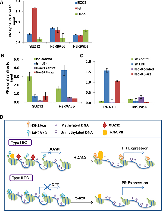 Figure 5: Mechanisms of progressive PR silencing in endometrial cancer cells. (A) ChIP followed by q-PCR analysis of SUZ12, H3K9Ace or H3K9Me3 recruitment to the PGR promoter. (B) ChIP-PCR analysis. Ishikawa H cells were treated with or without 20 nM LBH589 for 24h, and Hec50 cells were treated with or without the hypomethylating agent 100 nM 5-aza-deoxycytidine (5-aza) for 5 days. ChIP followed by q-PCR for SUZ12 and H3K9Ace was used to determine recruitment of these factors to the PGR promoter. (C) ChIP-PCR analysis. ChIP followed by q-PCR for RNA polymerase II (RNA PII) and H3K9 trimethylation (H3K9Me3) was performed to assess occupancy on the PGR promoter. (D) Proposed model for PR repression in well-differentiated and poorly-differentiated endometrial cancer. In well-differentiated endometrial cancers, PR was transcriptional repressed by PRC2 and reversed by HDACi treatment, while in poorly-differentiated endometrial cancers, PR was suppressed by DNA methylation and reversed by a hypomethylating agent.