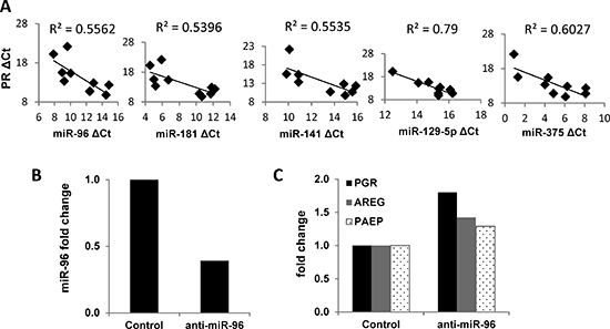miRNAs are a class of small non-coding RNAs that can orchestrate complex posttranscriptional gene expression by various mechanisms, such as mRNA degradation, transcriptional repression and inhibition of translation [23]. Acting in concert, multiple miRNAs fine tune the expression of important factors in endometrial cancer [24]. Several miRNAs are reported to target PR: miR-96 in endometrial cancer and miR-26a and miR-181a in MCF7 breast cancer cells [25, 26]. To further understand the role of miRNAs in PR regulation, de-identified tumor samples from five patients with early stage and grade endometrial cancer were analyzed along with matched adjacent non-malignant tissue. In Figure 1, we established that PGR expression is decreased significantly in the tumor tissue compared to the adjacent tissue. Next, we correlated these findings with the expression of miRNAs believed to regulate PR in those samples. We found that the expression of five miRNAs was inversely correlated with PGR expression, among them and most prominently, miR-96 (Fig. 6A). We hypothesize that these miRNAs may mediate PR post-transcriptional repression. To confirm PR as a direct target of these miRNAs, anti-miRNAs were transiently transfected into Ishikawa H cells. Of the tested miRNAs, the most robust effect on PR was achieved with anti-miR-96. Specifically, PGR mRNA expression as well as expression of PR target genes AREG and PAEP was increased (Fig. 6C).