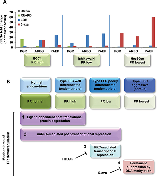 Figure 7: Systematic analysis of strategies to restore functional PR expression in distinct models of endometrial cancer. (A) Three endometrial cancer model cell lines, ECC1, Ishikawa H and Hec50co cells were treated with DMSO control, 1 μM RU486+1 μM PD0325901 for 24h, 20 nM LBH589 for 24h or 100 nM 5-aza for 3 days. mRNA expression of PGR, AREG and PAEP were measured by q-PCR, normalized to 18S and displayed as fold change to DMSO control. Comparisons of normalized expression values (ΔCt) employed the conventional ΔΔCt fold change method. In ECC1 cells, which express PR at baseline, treatment with the progestin antagonist RU486 and the MAPK inhibitor PD0325901 validates the dynamic PR regulation by ligand-mediated degradation. In Type I Ishikawa cells, only an HDACi effectively restores functional PR, whereas a hypomethylating agent is necessary for Type II Hec50co cells. (B) Proposed model of PR downregulation mechanisms during endometrial cancer progression.