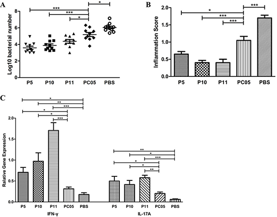 Figure 5: P5 (inosine 5ʹ-monophosphate dehydrogenase, IMPDH), P10 (type II citrate synthase, CS II), and P11 (urease subunit beta, UreB) each had better protection against H. pylori challenge than the PC05 component. Mice were immunized with P5, P10, P11, PC05, or PBS together with Freund’s adjuvant. (A) Bacterial colonization in stomachs was detected by quantitative real-time PCR. (B) Mouse stomach inflammation score. Hematoxylin and eosin stained histological sections were evaluated by two experienced pathologists in a blinded fashion. (C) INF-γ and IL-17A responses were evaluated in isolated stomach lymphocytes by quantitative real-time PCR at the mRNA level. N = 10, one-way ANOVA test with post-test Bonferoni, *P < 0.05, **P < 0.01, ***P < 0.001.