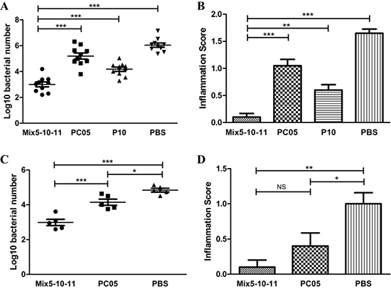 Figure 6: Multi-subunit vaccine consisting of three dominant antigens (Mix5-10-11) had a better efficiency than a single-subunit vaccine. Mice were immunized with Mix5-10-11, PC05, P10, or PBS. Mix5-10-11 was more protective, resulting in lower H. pylori colonization (A) N = 10, and a lower inflammation score (B) N = 10. Mix5-10-11 or PC05-specific Th1 and Th17 splenic lymphocytes were cultured and sorted by immunomagnetic beads. Equal amounts of specific CD4 T cells or PBS were injected into mice. After H. pylori challenge, stomach bacteria number (C) N = 5, and inflammation score (D) N = 5 were evaluated. One-way ANOVA test with post-test Bonferoni. NS, not significant; *P < 0.05, **P < 0.01, ***P < 0.001.