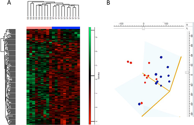 Figure 3: (A) Heat map of differentially expressed proteins in pancreatic cancer with long survival (LS) and short survival (SS). The heat map visualized two-way unsupervised hierarchical clustering of 171 differentially expressed proteins in pancreatic cancer patients with short survival (SS) compared to those with long survival (LS) (P < 0.01, SS/LS fold Change ≥ 2). (B) Global principal component analysis of protein profiles in 19 samples. Dots representing pancreatic cancer (PC) patient samples with long survival (blue) and short survival (red) were well clustered, which was in good agreement with the clinical classification.