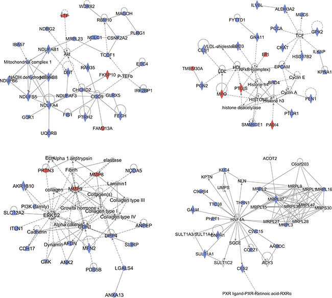 Figure 5: Protein-protein relationships among prognostic candidate proteins extracted by the Ingenuity IPA analysis. Top four subnetworks shown. Red: proteins upregulated in short survival patients. Blue: proteins upregulated in long survival patients.
