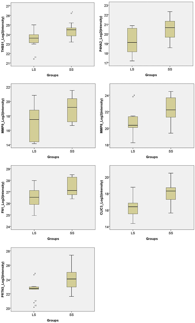 Figure 7: Boxplot of intensities of prognostic proteins from PRM phase in PDAC patients with “short” survival (SS) compared to “long” survival (LS) (all P < 0.05). Seven proteins (THBS1, P4HA2, MMP9, MMP8, FN1, CLIC3, PRTN3) were significantly upregulated (SS/LS fold change > 1.5) in patients with SS while CLCA1 were significantly upregulated (SS/LS fold change < 0.5) in patients with LS.