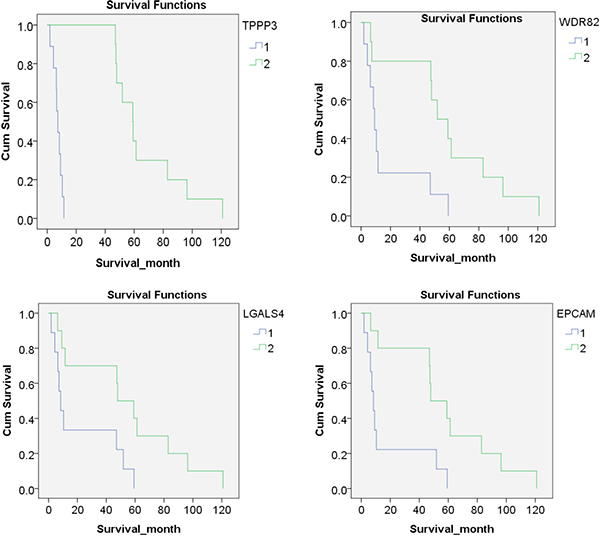 To evaluate the potential candidate proteins, 171 differentially expressed proteins from the discovery phase were selected for targeted proteomics study. Unfortunately, 98 proteins of them failed in the PRM approach. Finally, 73 proteins were successfully detected and scheduled in one assay panel. The proteins were detectable in all samples. Thirty-six proteins were differentially expressed between the two groups, including 7 proteins and 29 proteins statistically upregulated in “short” survival group and “long” survival group, respectively (P < 0.05). Of them, seven proteins were significantly upregulated (SS/LS fold change > 1.5) in patients with “short” survival (MMP9, CLIC3, MMP8, PRTN3, P4HA2, THBS1, FN1), while 18 proteins were significantly upregulated (SS/LS fold change <0.5) in patients with “long” survival (TMED4, GPD1L, SOD3, NPNT, ABHD14B, ACADSB, DHRS1, EPCAM, WDR82, HDHD2, TPPP3, CHGA, LGALS4, TTC38, COQ9, CES2, VIL1, CLCA1) (Figure 7 and Table 1). After the expression values of each protein were divided into two groups: lower expression (9 cases) and higher expression (10 cases), Kaplan-Meier analysis showed that four proteins were significantly negatively correlated to the survival months (TPPP3, WDR82, LGALS4 and EPCAM, P values were < 0.001, 0.008, 0.020 and 0.010, respectively) (Figure 8).
