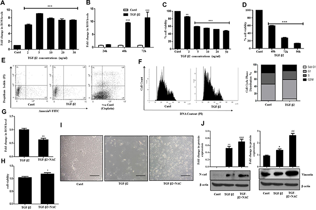 Figure 2: TGF-β2 induced EMT is ROS dependent. (A) H2DCF-DA fluorimetric assay showing intra-cellular accumulation of ROS after treatment of Huh7 cells with TGF-β2 at the following concentrations (2, 5, 10, 20, 50 ng/ml; 48 h). Untreated control was taken as arbitrary unit “1”. (B) Bar graph showing time dependent increase in intracellular ROS accumulation in Huh7 cells after treatment with TGF-β2 (5 ng/ml; 48 h). (C) Viability of Huh7 cells measured through MTT assay upon exposure to varied doses of TGF-β2 for 48 h. (D) Time dependent alterations in cell viability as analyzed through MTT assay upon treatment with TGF-β2 (5 ng/ml). (E) Detection of apoptotic cells after TGF-β2-treatment (5 ng/ml) for 48 h, as analyzed through flow cytometry using AnnexinV-FITC/Propidium Iodide (PI) staining. Cisplatin (35 μm, 24 h) treated cells were taken as positive control. (F) Cell cycle analysis of TGF-β2-exposed cells (48 h) using PI dye by flow cytometry. A shift in G1 peak is marked by an arrow. Percentage of cells in each phase of cell cycle is represented by bar diagram. (G) Intracellular levels of ROS upon addition of NAC in TGF-β2 (5 ng/ml) exposed Huh7 cells as analyzed through H2DCF-DA fluorimetric assay. (H) MTT assay showing percentage cell viability upon inhibition of ROS (5 ng/ml) for 48 h; 5 mM of NAC was added 1 h prior to TGF-β2 exposure (5 ng/ml; 48 h). (I) Phase-contrast microscopic images following TGF-β2 (5 ng/ml, 48 h) or TGF-β2 plus NAC treatment for 48 h in Huh7 cells. The scale bar represents 50 μm, images were taken at 40× (J) Immunoblot analysis showing expression of N-cadherin and Vimentin upon quenching of ROS with NAC treatment.