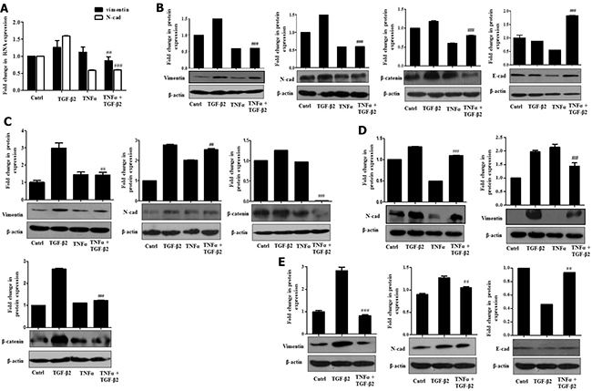 Figure 5: TNF-α suppresses TGF-β2-induced EMT. (A) Real time PCR results showing expression of Vimentin and E-cadherin mRNA levels, upon simultaneous exposure of Huh7 cells to TGF-β2 (5 ng/ml) and TNF-α (20 ng/ml) for 48 h. (B) Immunoblot analysis showing protein expression of Vimentin, N-cadherin, β-catenin and E-cadherin upon simultaneous exposure of TGF-β2 (5 ng/ml) and TNF-α (20 ng/ml) for 48 h in Huh7 cells. (C) Immunoblot analysis showing protein expression of Vimentin, N-cadherin and β-catenin upon 72 h of simultaneous exposure to TGF-β2 (5 ng/ml) and TNF-α (20 ng/ml) in Huh7 cells. (D) Immunoblot analysis showing protein expression of N-cadherin and β-catenin upon 96 h of exposure to TGF-β2 (5 ng/ml) and TNF-α (20 ng/ml). (E) Immunoblot analysis showing protein expression of Vimentin, N-cadherin and E-cadherin upon exposure to TGF-β2 (5 ng/ml) and TNF-α (20 ng/ml) following rescue of serum with 10% FBS. Expression in untreated control was taken as arbitrary unit “1”. GAPDH expression was used as housekeeping control for RT-PCR and β-actin served as loading control for immunoblot.
