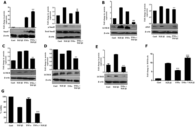 Figure 6: TNF-α antagonizes TGF-β2-induced signaling and autophagy. (A) Immunoblot analysis showing smad7 and p-Smad-2 protein expression in Huh7 cells exposed to TNF-α (20 ng/ml, 48 h) along with TGF-β2 (5 ng/ml) for 48 h. (B) Immunoblot analysis of autophagic markers- LC3B-II and ATG5 in the presence or absence of TNF-α (20 ng/ml, 48 h) along with TGF-β2 (5 ng/ml). (C) Immunoblot analysis of LC3B-II post 72 h of TNF-α (20 ng/ml) and TGF-β2 (5 ng/ml) treatment. (D) Immunoblot analysis of LC3B-II post 96 h of TNF-α (20 ng/ml) and TGF-β2 (5 ng/ml) treatment. (E) Immunoblot analysis of LC3B-II upon simultaneous exposure to TGF-β2 (5 ng/ml) and TNF-α (20 ng/ml) for 48 h when serum was rescued with 10% FBS. (F) H2DCF-DA fluorimetric analysis showing elevated ROS levels upon simultaneous exposure to TGF-β2 (5 ng/ml) and TNF-α (20 ng/ml) for 48 h. (G) MTT assay showing percentage cell viability upon TGF-β2 (5 ng/ml) and TNF-α (20 ng/ml) treatment for 48 h, when compared to independent cytokine treatment or untreated cells.