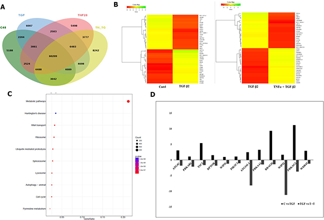 Figure 7: Transcriptomic analysis showing TNF-α-mediated antagonism of TGF-β2 induced effects. (A) Venn diagram showing total number of transcripts and common transcripts across four samples sequenced- untreated control (C48), TGF-β2 (5 ng/ml; 48 h), TNF-α (20 ng/ml; 48 h) and TGF-β2 (5 ng/ml; 48 h) plus TNF-α (20 ng/ml; 48 h). (B) Heatmap demonstrating top 40 de-regulated transcripts in TGF-β2 (5 ng/ml; 48 h) treated samples when compared to untreated control; and in TGF-β2 (5 ng/ml; 48 h) plus TNF-α (20 ng/ml; 48 h) treated samples when compared to only TGF-β2 segregated based on their log2 fold change values. (C) Pathway enrichment analysis showing the top 10 pathways getting de-regulated post TGF-β2 treatment. (D) Graph showing up or down regulation of transcripts involved in autophagy, upon exposure to TGF-β2 (5 ng/ml; 48 h) in comparison to untreated control; and in TGF-β2 (5 ng/ml; 48 h) plus TNF-α (20 ng/ml; 48 h) treated samples when compared to only TGF-β2.