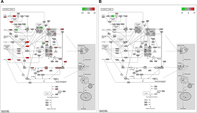 Figure 8: KEGG pathway graph rendered by Pathview. KEGG Pathview showing autophagy pathway genes up or down regulated in TGF-β2 (5 ng/ml; 48 h) treated samples with respect to control (A), and in TGF-β2 (5 ng/ml; 48 h) plus TNF-α (20 ng/ml; 48 h) treated samples compared to only TGF-β2 (5 ng/ml; 48 h) (B).