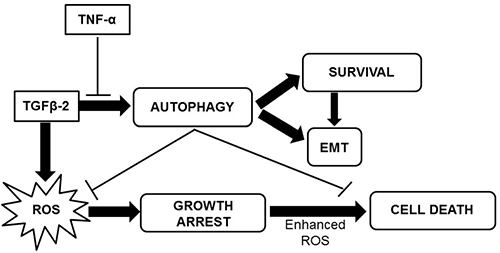 Since, recent studies suggest that mitochondrial ROS are essential for TGF-β-mediated gene expression [37], we explored ROS levels upon TGF-β exposure as well. Significantly increased ROS levels were observed in cells exposed to TGF-β. Interestingly, quenching of ROS by NAC resulted in an increased expression of EMT markers. In contrary, inhibition of autophagy resulted in a significant enhancement in ROS levels suggesting that TGF-β-induced autophagy limits ROS facilitating EMT. We assume that this increase in ROS levels, upon autophagy inhibition, was the trigger to tip the balance of Huh7 cells from survival towards cell death. This role of ROS and autophagy in TGF-β-induced EMT is demonstrated through a schematic diagram (Figure 9).