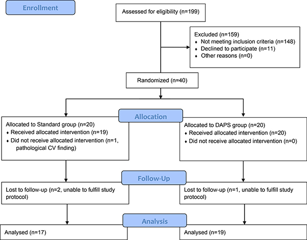 The study population consisted of 36 recruited physically inactive healthy subjects between 38–64 years of age and with a BMI range of 20–26. None of the participants had ongoing or a previous history of cardiovascular disease. Clinical characteristics of the whole study population are presented in Table 1. The number of males was 10 (59%) and 9 (47%) and mean age was 54 ± 12 years and 55 ± 5 years in standard versus DAPS group, respectively. Of the 36 participants, three did not complete the hyperemic echocardiography investigation and TDE-CFR protocol. Two of the participants had incomplete EndoPAT investigations and up to six had missing data on laboratory blood analyses.