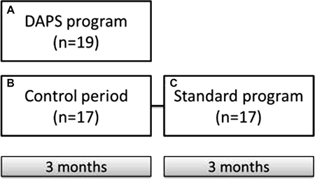 Figure 2: Study design. Schematic overview of study design. Subjects were randomized into DAPS with a three months intervention period as well as a standard group including a three months control period followed by a three months standard exercise period. The primary objective of the current study was to compare effects of the DAPS program (A) including personalized exercise training and Mediterranean-inspired diet with a time-aligned initial control period of the standard group (B). Secondary objective was to compare the DAPS program (A) with the standard program (C), mimicking a regular gym and Mediterranean-inspired nutrition program. Finally, the third objective was to compare the standard program (C) with its own control period (B). DAPS = Diagnosis, Analysis, Personalization, Supervision.