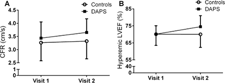 Figure 3: Change in coronary flow reserve and hyperemic left ventricle function after a personalized supervised health intervention program. The number of 36 healthy inactive volunteers were recruited for study participation and randomized into a three months DAPS program (n = 19) or a three months control period followed by three months standard intervention program (n = 17). (A) Shows the increase in CFR after DAPS intervention compared to controls, p = 0.005. (B) Displays the amelioration in hyperemic left ventricle ejection fraction in the DAPS group compared to controls, p = 0.022. Data are presented with mean ± SD. CFR = coronary flow reserve; DAPS = Diagnosis, Analysis, Personalization, Supervision; LVEF = Left Ventricle Ejection Fraction.
