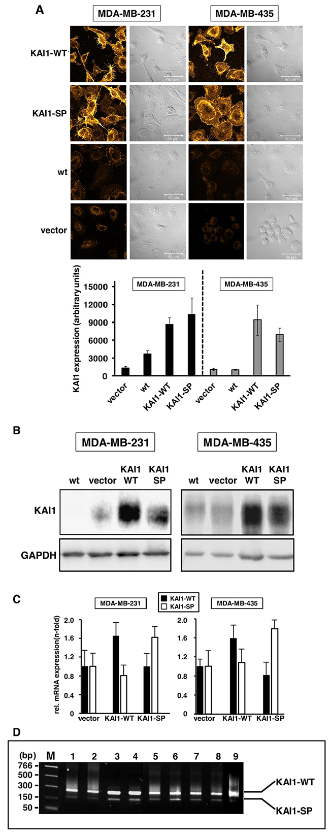 By qPCR, we documented in stable breast cancer cell transfectants elevated KAI1-WT- and KAI1-SP-mRNA levels over vector transfectants (MDA-MB-231 KAI1-WT: appr. 1.6-fold; MDA-MB-435 KAI1-WT: appr. 1.5-fold; MDA-MB-231 KAI1-SP: appr. 1.6-fold; and MDA-MB-435 KAI1-SP: appr. 1.8-fold) (Figure 1C).