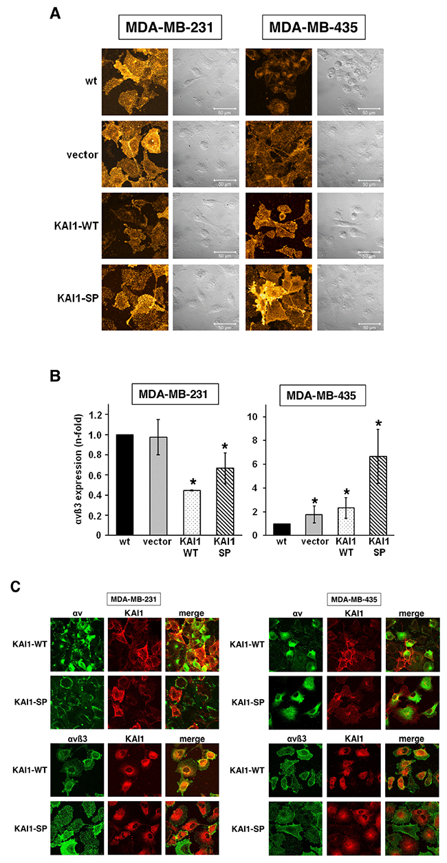 We next wondered whether stable cellular expression of either of the two KAI1 proteins affects αvβ3 expression levels. Indeed, by immunocytochemical staining and FACS analysis of MDA-MB-231 cells, we found that both KAI1 proteins decreased αvβ3 expression levels, KAI1-WT by up to 50% and KAI1-SP by up to 30% when compared to vector-transfectants and wt cells. In contrast, in MDA-MB-435 cells, both KAI1 proteins induced αvβ3 levels, KAI1-WT by up to 2.5-fold and KAI1-SP by up to 6.5-fold (Figure 2A and 2B).