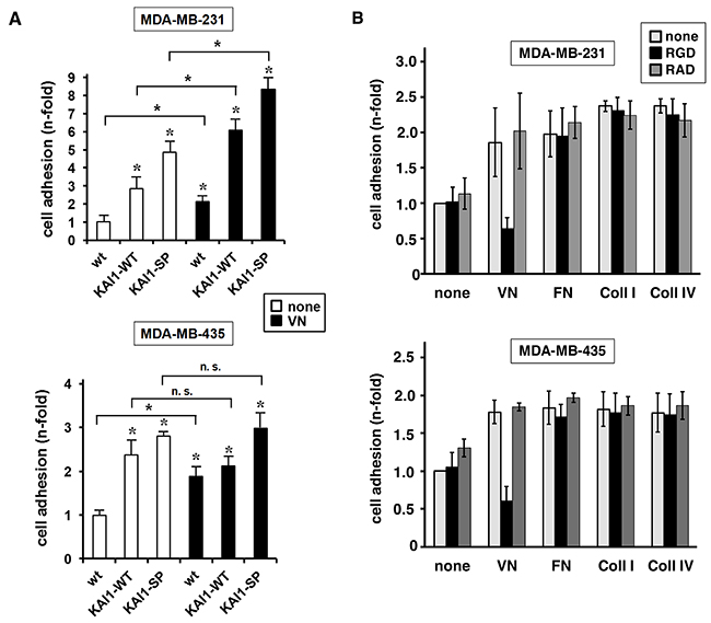 Figure 3: Effect of KAI1-WT or KAI1-SP on αvβ3/VN-mediated breast cancer cell adhesion. (A) The cell adhesive capacity of KAI1-WT- or KAI1-SP-transfected breast cancer cells was monitored in the absence (none) or presence of VN as described. Vector transfectants and wt cells with low expression of KAI1 proteins served as controls. Data are depicted as mean values of three independent experiments (± s.d.) as “n-fold” (± s.d.), by setting the adhesive capacity of wt cells adherent to uncoated cell culture plates to “1”. Statistically significant differences (p <0.05) as compared to the respective wt cells adherent to non-pretreated cell culture dishes are indicated by an asterisk. Also, significance of data comparing a respective cell transfectant in the absence or presence of VN are indicated. (B) Monitoring of cell adhesion profiles of MDA-MB-231 and -435 wt cells to different ECM proteins, VN, FN, Coll-I, or Coll-IV or uncoated cell culture dishes (none). The cell adhesive capacity was quantified as described before [28, 29]. Integrin αvβ3-dependent cell adhesion was recorded in the presence of the αvβ3-directed cyclic peptide cRGDfV as competitor [35, 36]. The non-integrin binding peptide cRADfV served as control. Data of three independent experiments are given as mean values (± s.d.) by setting the adhesive strength of cells grown in the absence of any ECM protein and peptide to “1”.
